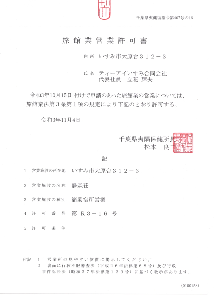 旅館業営業許可証